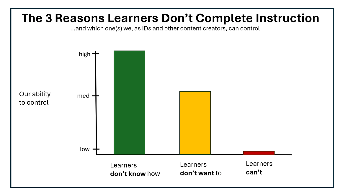 When we don’t understand why learners aren’t completing instruction, we can waste time trying to fix something that isn’t broken. For example, we might spend a lot of effort trying to gamify instruction or boost engagement (in other words, addressing #2 – Learners don’t want to) when the real problem was our instructional content (#1 – Learners don’t know how to).
